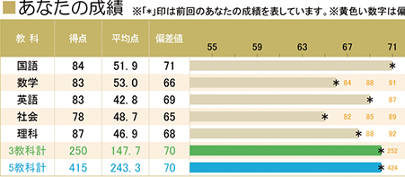 過去に受験した結果の推移がグラフで示されるので、成績の向上度が一目でわかります。