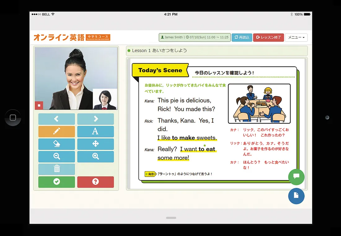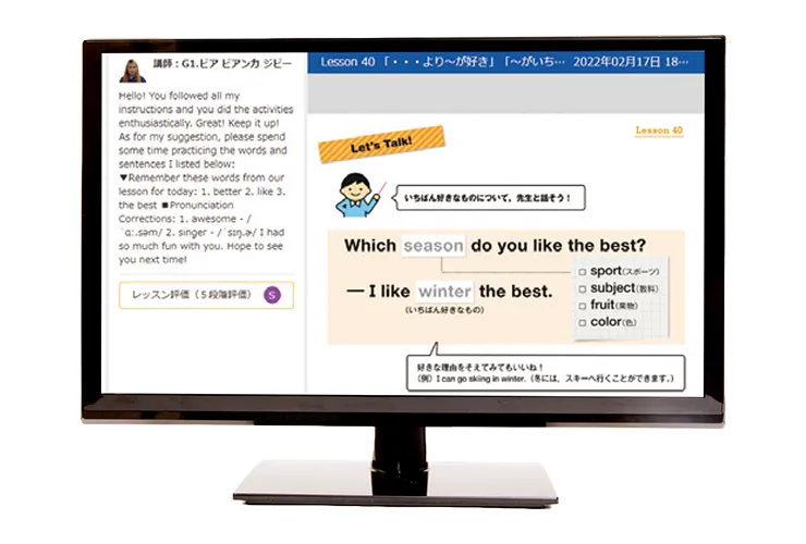外国人講師によるリアルタイムオンラインレッスンでは、「パターンプラクティス(定型文の発話練習)」と「プレゼンテーション(習った内容を英語で表現)」を中心に進めます。聞く・話す経験を積み重ねながらスピーキング・リスニング技能を育成。レッスン後には講師からのコメントで理解度も確認できます。