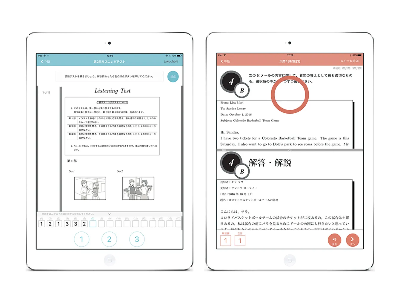 解答結果はその場で自動判定され、間違えた問題は個人リストとして自動保存されます。苦手問題を効率よく復習できるため、理解を深めながら学習を進めることができます。解説には和訳や文法説明もあり、内容をしっかり理解できます。