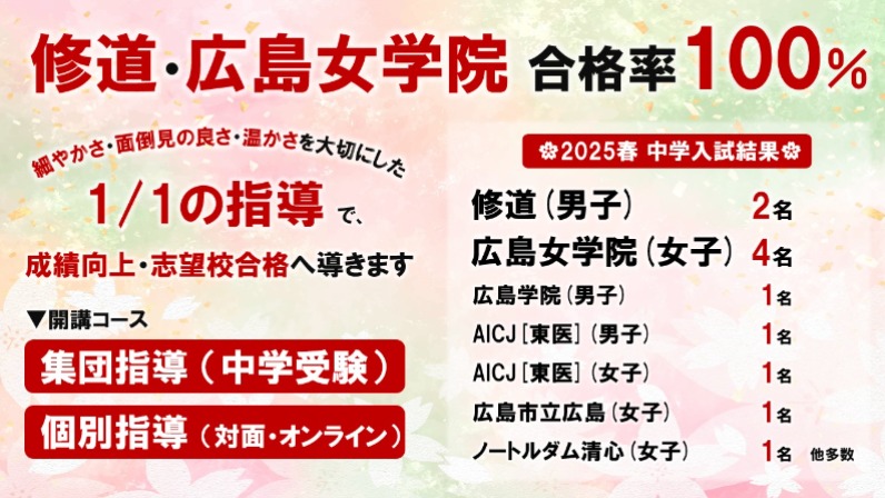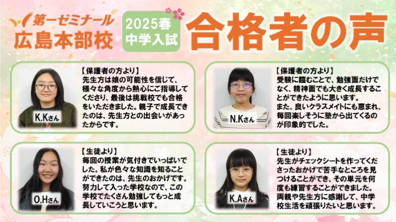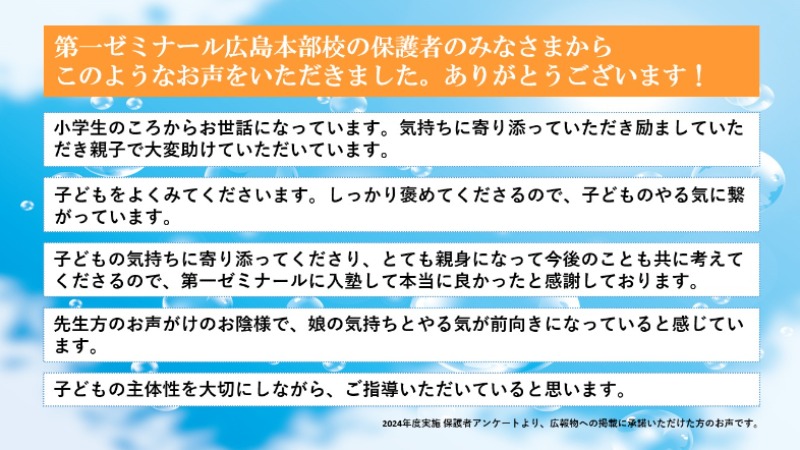 小・中・高校生は、些細なことで、自信をもったり、傷ついたり、いい意味でもまた逆の意味でも多感な頃です。世の中には「 失敗 」はなく、全ては「 成功 」へのプロセス。「 成長無限 」の視点で、「 可能性を信じ切る 」。第一ゼミナール広島本部校では、心に響く1/1のアプローチを通じて「 成績向上・人間的成長 」を果たし、「 プラスサイクル 」を自分自身でまわしていくことができる人となるよう指導し、勇気づけていきます。