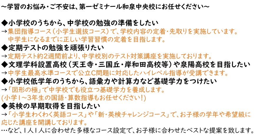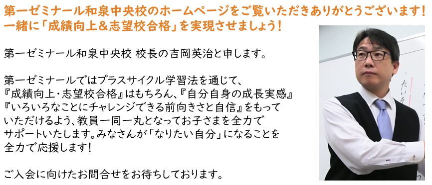 ホーム > 各校一覧 > 大阪府の市町村から学習塾を探す > 第一ゼミナール和泉中央校の教室紹介(和泉市の学習塾)