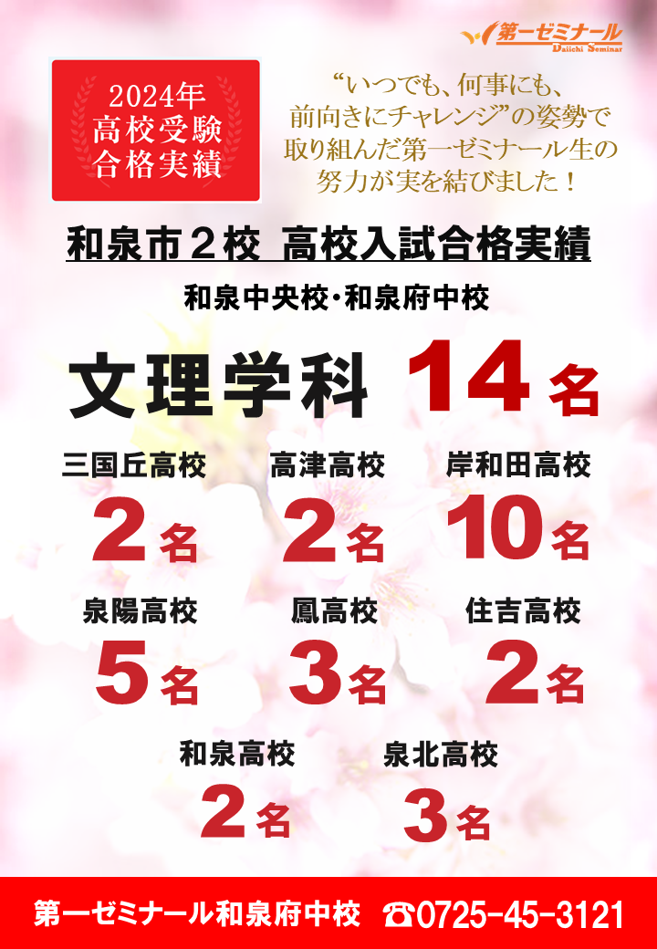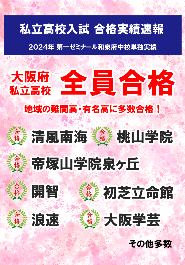 1人1人の頑張りの成果です。第一ゼミナール和泉府中校では1人1人の成績向上・志望校合格に真剣に向き合ったきめ細かいフォローアップを大切にしています。和泉中学・郷荘中学の高校受験は第一ゼミナール和泉府中校にお任せください!第一ゼミナール和泉府中校について