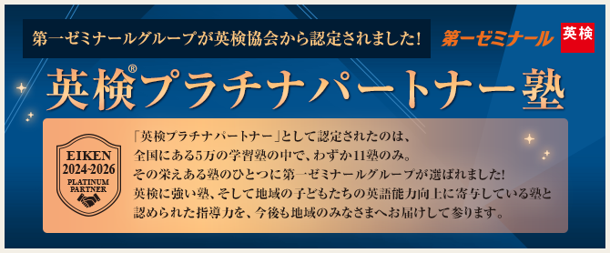 第2回公開テストの小5生・小6生の英語のテストは英検プレテスト(RL)となります。第一ゼミナールは、公益財団法人 日本英語検定協会(英検協会)より 「英検®プラチナパートナー塾」 に認定されました。(大阪では2塾のみ)この機会により多くの皆様に今後ますます重要となる英語力を測る機会をご提供させて頂きます。