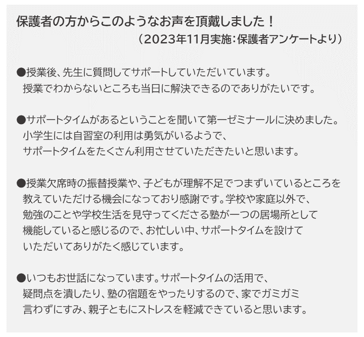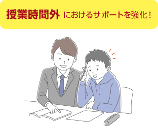 第一ゼミナールでは、授業時間とは別に、生徒一人ひとりの学習を個別にサポートする「学習サポートタイム」を設定しています。この時間で、家庭学習(宿題や復習)のサポート、塾内模試や定期テスト結果に基づくサポート、確認テスト結果に基づくサポート、やむを得ない理由で授業を欠席した生徒のサポートなど、さまざまなサポートを行っています。この時間は質問受付のできる教員もいるので、自分から質問するのが苦手な人も大丈夫!学習サポートタイムは、生徒の学習習慣の定着や成績向上に欠かせない時間です。第一ゼミナールは、生徒一人ひとりの学習をしっかりとサポートし、志望校合格を目指します。