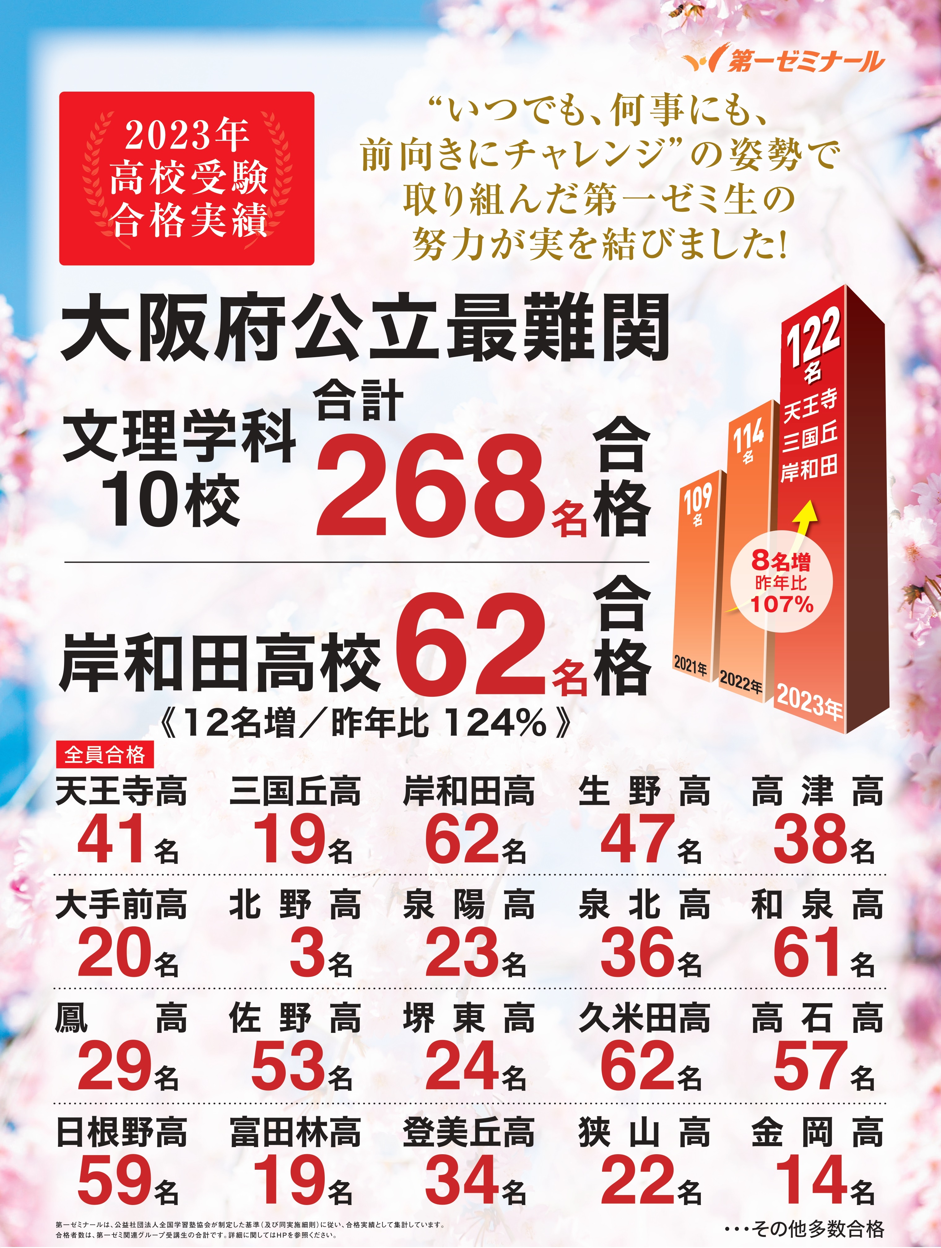 受験生1人1人の頑張りの成果です。第一ゼミナール東岸和田校は、岸和田高校・和泉高校を中心に、1人1人の夢の実現に向けたきめ細やかな指導を大切にしています。土生中学・桜台中学・葛城中学生の高校受験は第一ゼミナール東岸和田校にお任せください!
