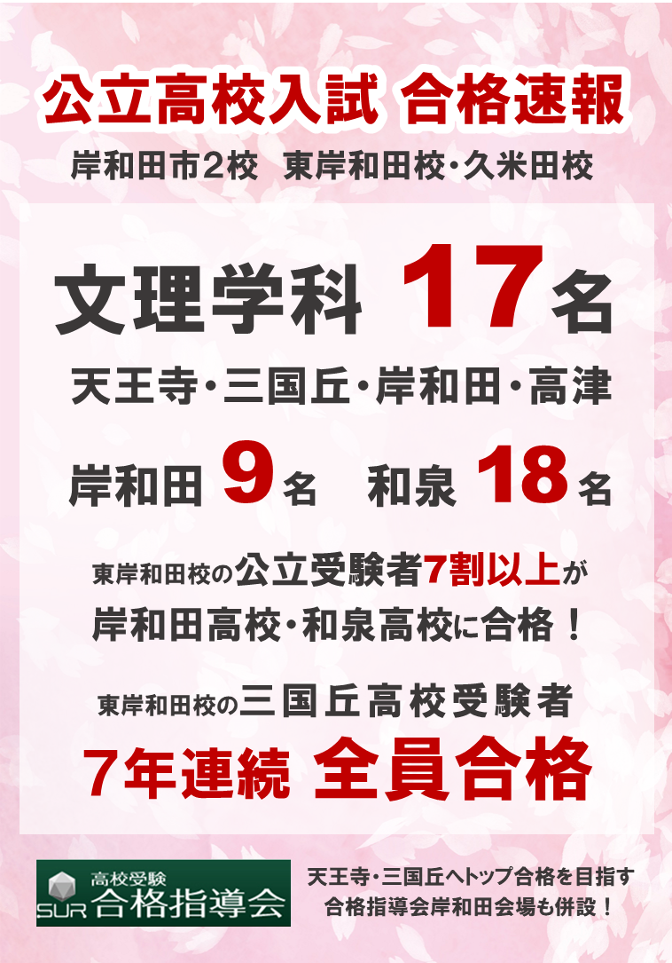 第一ゼミナール東岸和田校には、天王寺・三国丘へトップ合格を目指す、「SUR高校受験合格指導会_岸和田会場」が併設しています。合格指導会岸和田会場の入試結果もご覧ください。