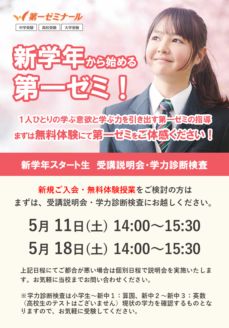 ぜひ受講説明会にご参加いただき、第一ゼミナールの考え方をより深く知っていただきたく思います。皆様のご来校を心よりお待ちしております。