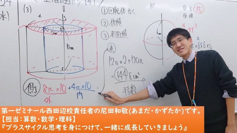 目標は「 志望校合格 」目的は「 社会で活躍できる人づくり 」。学習・受験という経験を通じて、「 自立し、自ら道を切り開ける生徒に育ってほしい。 」そう願って日々の指導を行っています。楽しみ・学ぶ考え方を育みます。西田辺地域の指導は第一ゼミ西田辺校にお任せください!