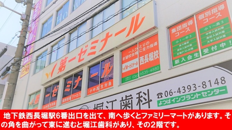 地下鉄西長堀駅6番出口を出て、南へ歩くとファミリーマートがあります。その角を曲がって東に進むと堀江歯科があり、その2階です。