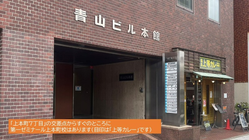 近鉄「 大阪上本町 」駅から徒歩3分。近鉄「 大阪上本町駅 」の地上改札を出ていただき、YUFURA側の出口に向かいます。その後、右手に見える「 上町筋 」沿いを南下します(駅とは反対方向)。りそな銀行さんを左手に見ながらしばらく進むと、「 上本町7丁目の交差点 」にセブンイレブンがありますので、その角を左折していただきます。そのまま直進していただき、1階に上等カレーさんが入っている「 青山ビル 」の2階になります。