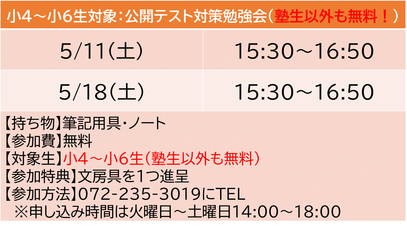 今回、小4〜小6生を対象に公開テストの対策勉強会を無料で実施します。