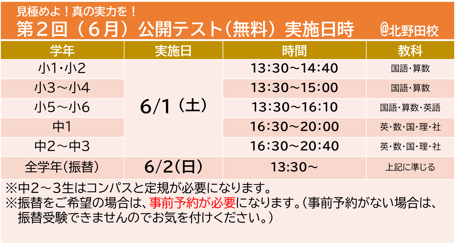 ※北野田校に関しましては、火〜土の14::00〜18:00で受け付けております。★★小4〜小6生対象:公開テスト対策勉強会★★