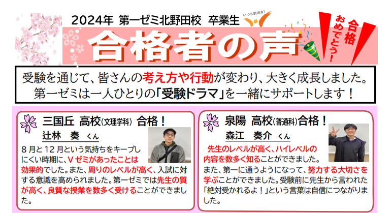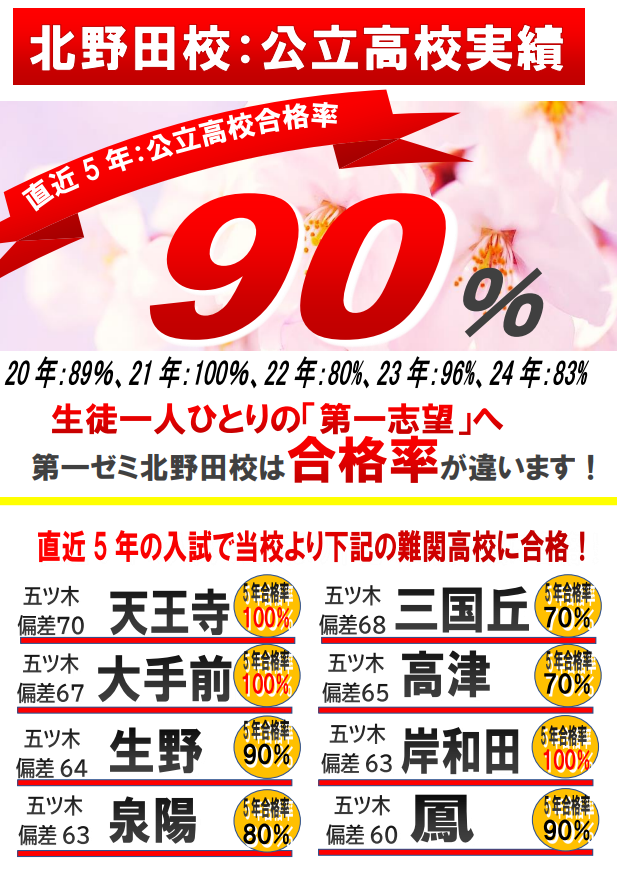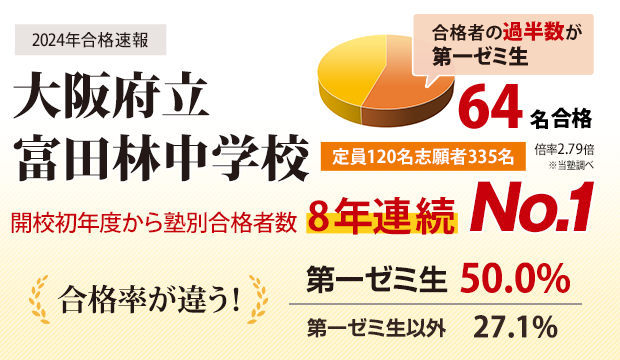 ※合格者数は、第一ゼミ関連グループ受講生の合計です。第一ゼミナールは、公益社団法人全国学習塾協会が制定した基準(及び同実施細則)に従い、合格実績として集計しています。詳細は第一ゼミナールHPの「合格実績」をご参照ください。第一ゼミは府立富田林中学校対策コース開講以来、