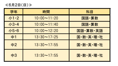 小5〜小6:国語・算数 中1〜中3:数学・英語(筆記用具をご持参ください。)