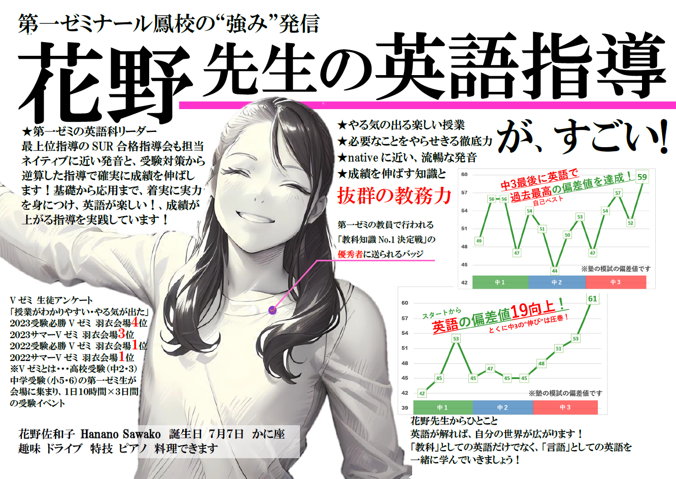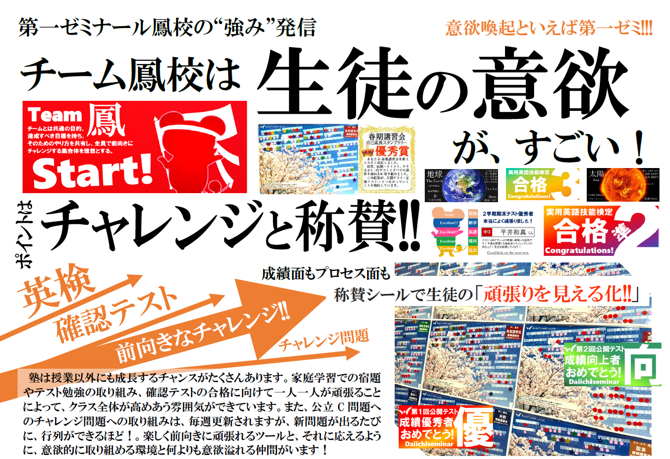 ご挨拶が遅れました。。。第一ゼミナール鳳校の平井と申します。『学習塾の責務は「生徒の意欲喚起」を通じ、成績向上・志望校合格を実現することにある』という考えのもと、独自の教育メソッド『プラスサイクル学習法』を確立してまいりました。