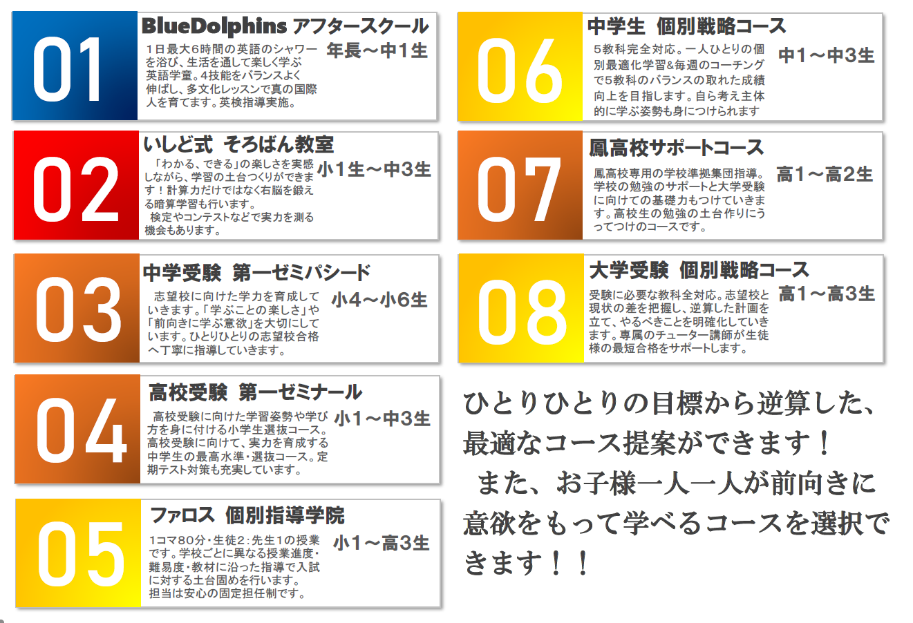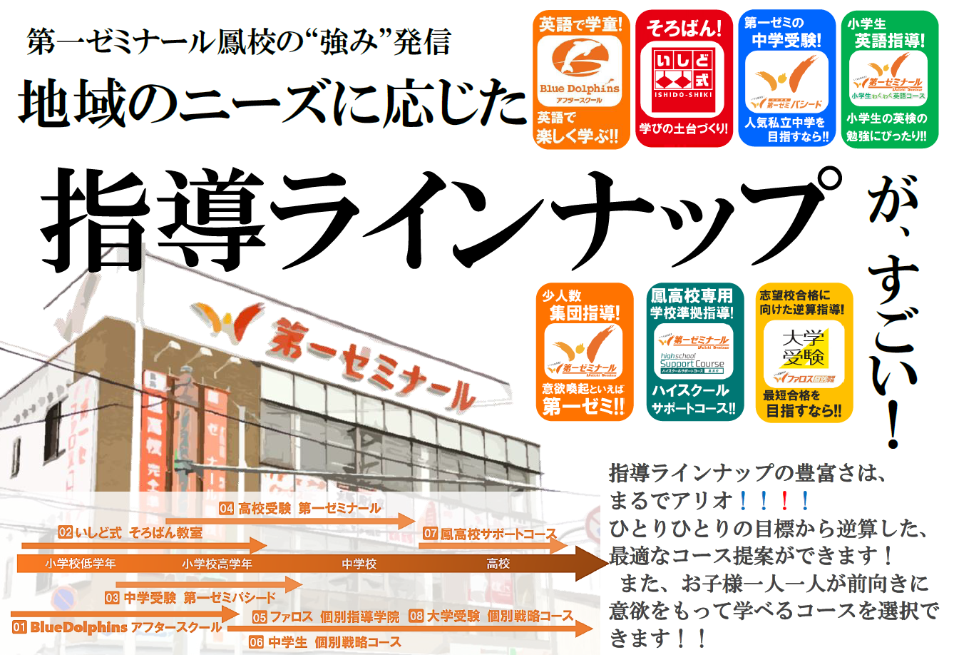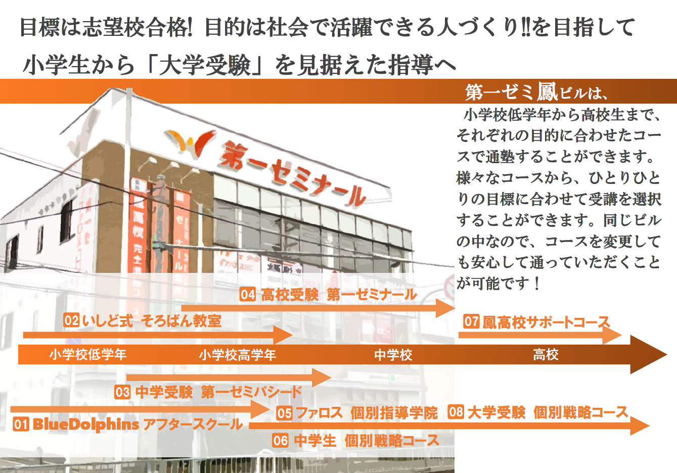第一ゼミナール鳳校では、小学生、中学生、高校生の一人ひとりに合わせた最適なコースとカリキュラムをご用意いたします。