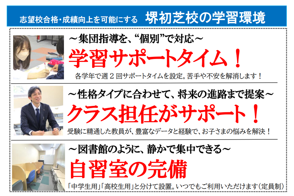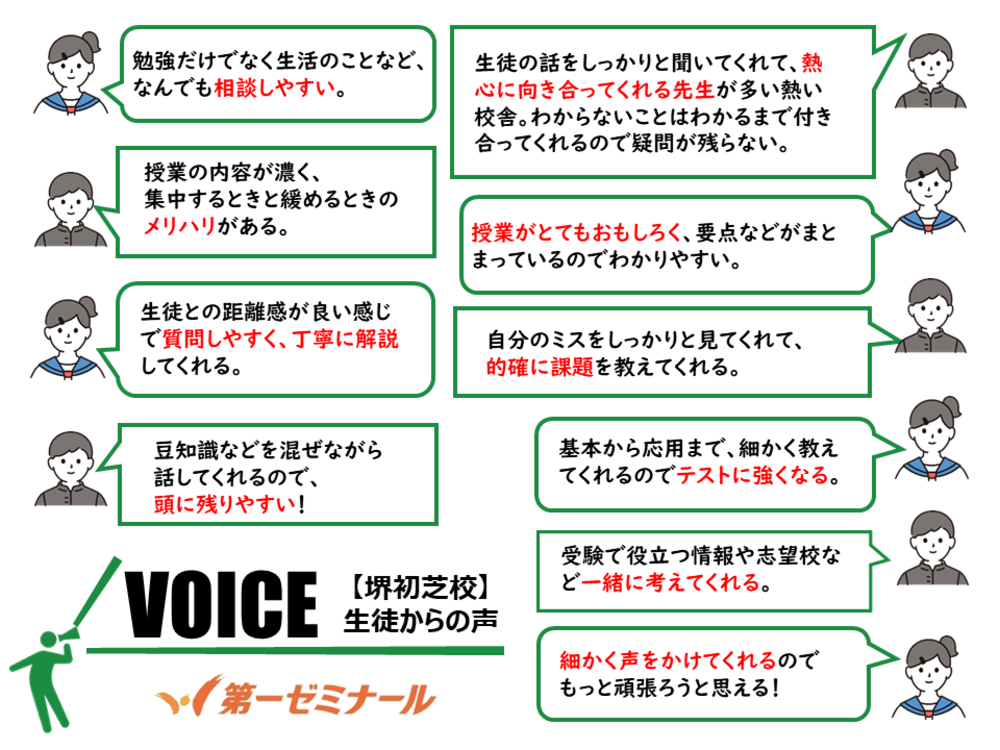 ホーム > 各校一覧 > 大阪府の市町村から学習塾を探す > 第一ゼミナール堺初芝校の教室紹介(堺市の学習塾)